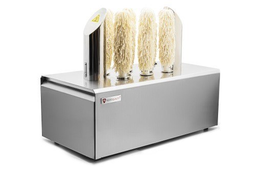 Opis: Profesjonalna polerka do szkła to niezastąpione urządzenie w barach, restauracjach oraz hotelach, które pozwala na błyskawiczne uzyskanie krystalicznej czystości kieliszków i szklanek Urządzenie skutecznie osusza i poleruje powierzchnię szkła, eliminując zacieki oraz smugi, co znacząco podnosi standard serwowanych napojów Wysoka wydajność polerki umożliwia przygotowanie do 40 szklanek w ciągu zaledwie jednej minuty, co jest kluczowe w miejscach o dużym natężeniu ruchu Zastosowanie ośmiu specjalistycznych szczotek polerujących (6 x 23 cm i 2 x 20 cm) pozwala na dokładne czyszczenie szkła o różnych kształtach i rozmiarach. Zintegrowana dmuchawa gorącego powietrza, osiągająca temperaturę do 85°C, gwarantuje szybkie odparowanie wilgoci i sterylność procesu Intuicyjna obsługa za pomocą jednego, czytelnego przełącznika On/Off sprawia, że praca z urządzeniem jest prosta i nie wymaga specjalistycznego przeszkolenia personelu Solidna konstrukcja wykonana z wysokiej jakości stali nierdzewnej oraz aluminium zapewnia trwałość i odporność na intensywną eksploatację w warunkach gastronomicznych Kompaktowe wymiary urządzenia pozwalają na jego łatwe umieszczenie na blacie roboczym, zapewniając ergonomiczną organizację stanowiska pracy. Proces polerowania jednej sztuki szkła trwa zaledwie kilka sekund, co pozwala na maksymalną oszczędność czasu pracowników Zapasowe szczotki RQCW23 (23 cm) i RQCW20 (20 cm) - 210 zł netto / 1 szt. Parametry techniczne: Wymiary [mm]: 635x330x510 Moc [kW]: 2,2 Zasilanie [V]: 230 Liczba szczotek [szt.]: 8 Temperatura nadmuchu [°C]: do 85 Waga netto [kg]: 19,76