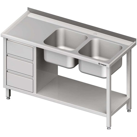 • Stół ze zlewem 2-kom.(P), z blokiem trzech szuflad i półką 1500x600x850 mm