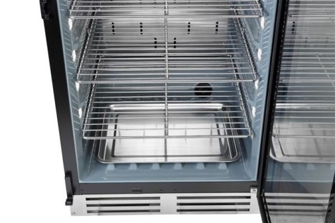 • zabezpieczenie przed niekontrolowanym zaburzeniem warunków panujących w komorze. Wbudowana lampa UVC do sterylizacji zapobiega rozwojowi bakterii i gwarantuje bezpieczne środowiska dla mięsa; po otwarciu drzwi szafy w trakcie procesu sezonowania bakterie nie będą miały szansy się rozwinąć. Chłodzenie wymuszone wentylatorem zapewniającym odpowiedni poziom cyrkulacji powietrza. Automatyczne odparowanie wody kondensacyjnej (pary wodnej). Światła LED ulokowane po obu stronach komory oraz na suficie. Zakres temperatury: 1-25?. Regulowany zakres wilgotności: 60-85%. Aktualny poziom wilgotności jest wyświetlany na panelu. Czynnik chłodniczy: R600a. Maks. udźwig drążka do haków: 50 kg. Maks. udźwig na hak: 25 kg
